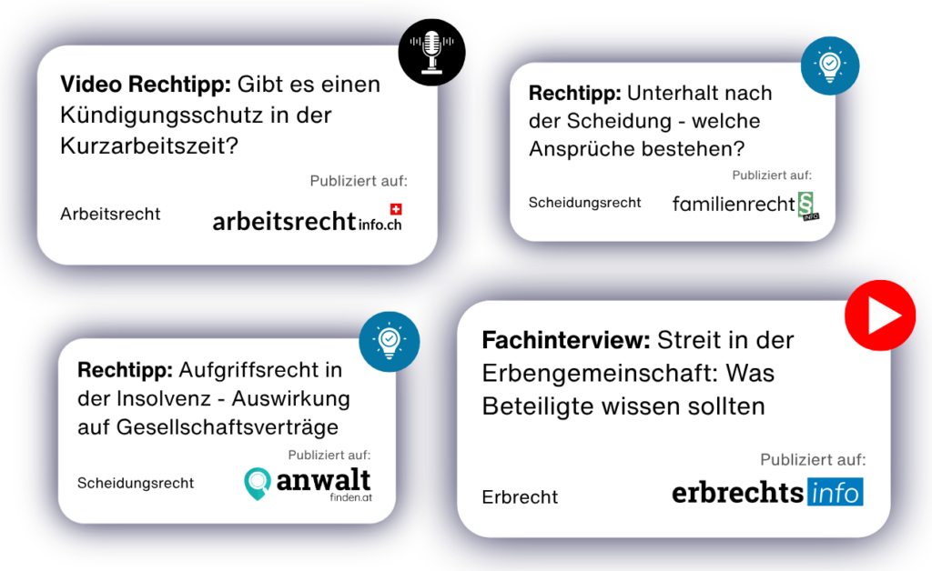 Ob Rechtstipps, Fachinterviews oder Podcasts – wir zeigen Ihre Kompetenz so, dass sie Mandanten überzeugt und KI-Systeme richtig einordnen. So entsteht früh ein Expertenbild, das sich durch Ihre gesamte Online-Präsenz zieht.