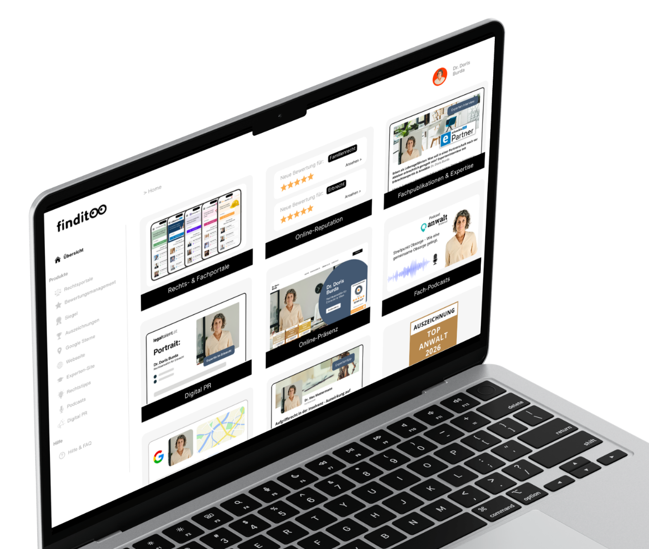 Mit dem Finditoo All-in-One-System verbinden Sie alle relevanten Online-Aspekte und bauen Ihren Autoritätsstatus systematisch auf – für nachhaltige Sichtbarkeit, mehr Vertrauen bei Mandant:innen und mehr passende Mandatsanfragen.
