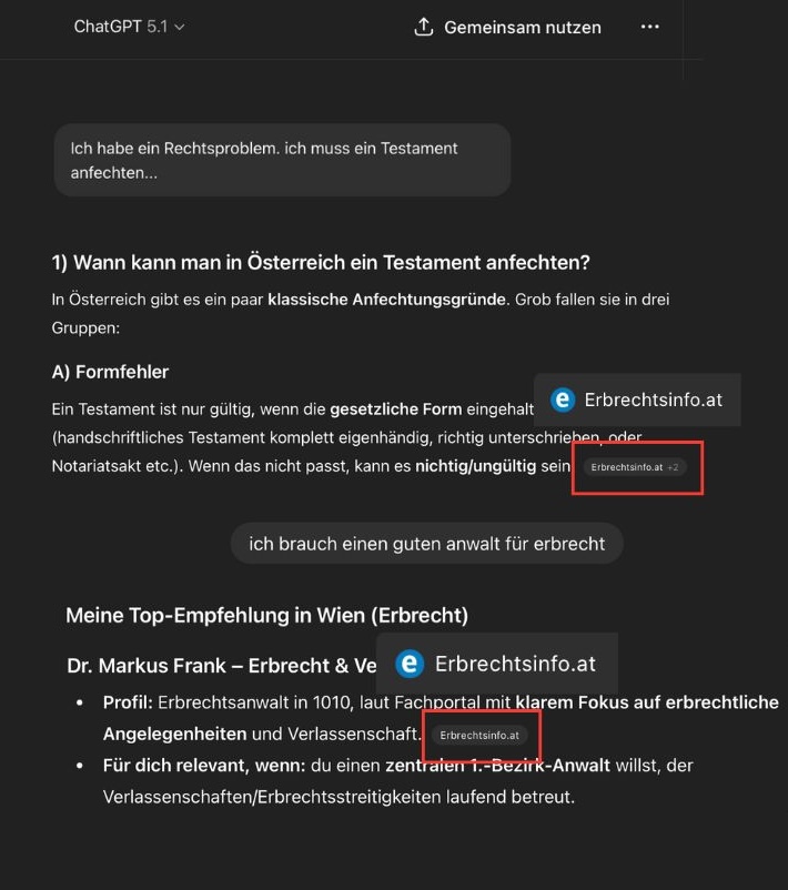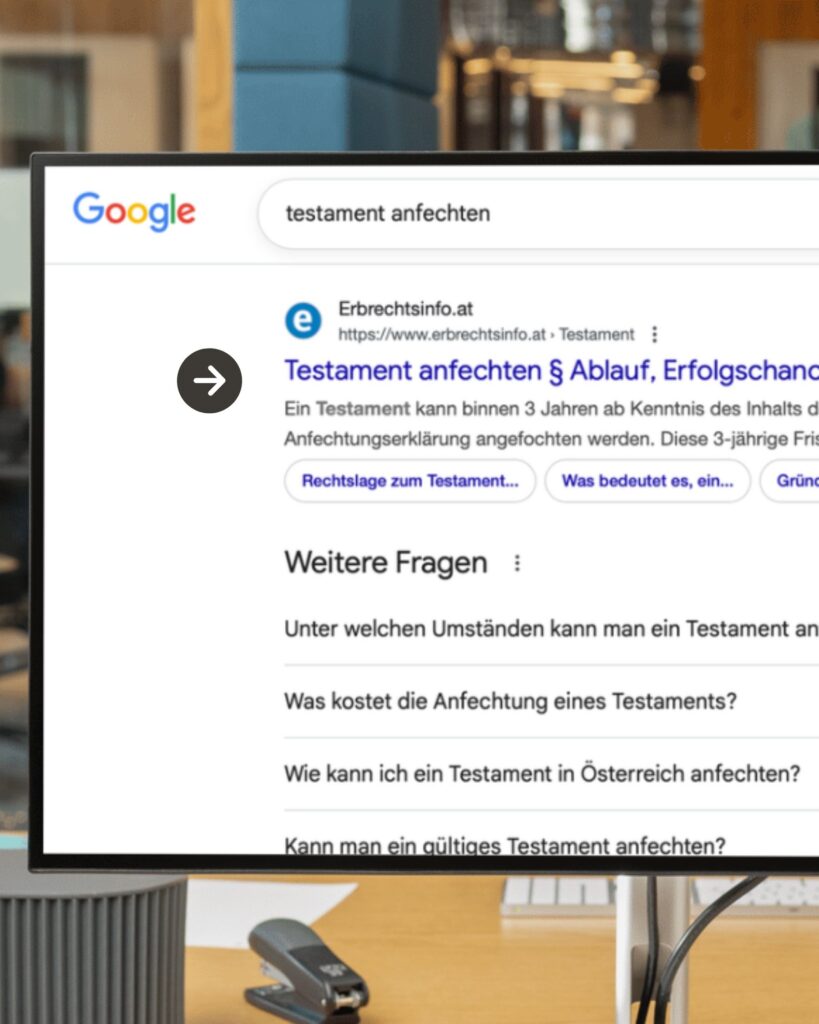 Eine Präsenz auf einem Rechtsportal bringt Sie genau dorthin, wo Mandanten aktiv nach Rechtslösungen und passenden Anwälten suchen. Gleichzeitig stärkt Ihr Profil Ihren fachlichen Kontext für Google – so werden Sie auch unter relevanten Suchbegriffen sichtbar. Für KI-Systeme ist dieser rechtliche Rahmen ein Top-Signal: Sie erkennen Ihre Spezialisierung klarer und empfehlen Ihre Kanzlei bei passenden Anfragen häufiger als Treffer.