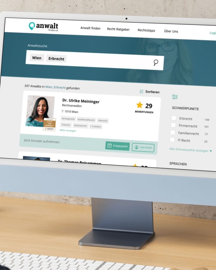 Bei einem von 22 Finditoo Rechtsportalen sofort online als Experte sichtbar – genau dort, wo Mandanten heute nach Rechtslösungen in Ihrem Fachgebiet suchen: bei Google & KI unter relevanten Suchbegriffen und auf spezialisierten Rechtsportalen. So werden Sie gefunden, wenn der Bedarf akut ist – und erreichen monatlich tausende Rechtssuchende, die aktiv nach Lösungen und Rechtsexperten suchen.