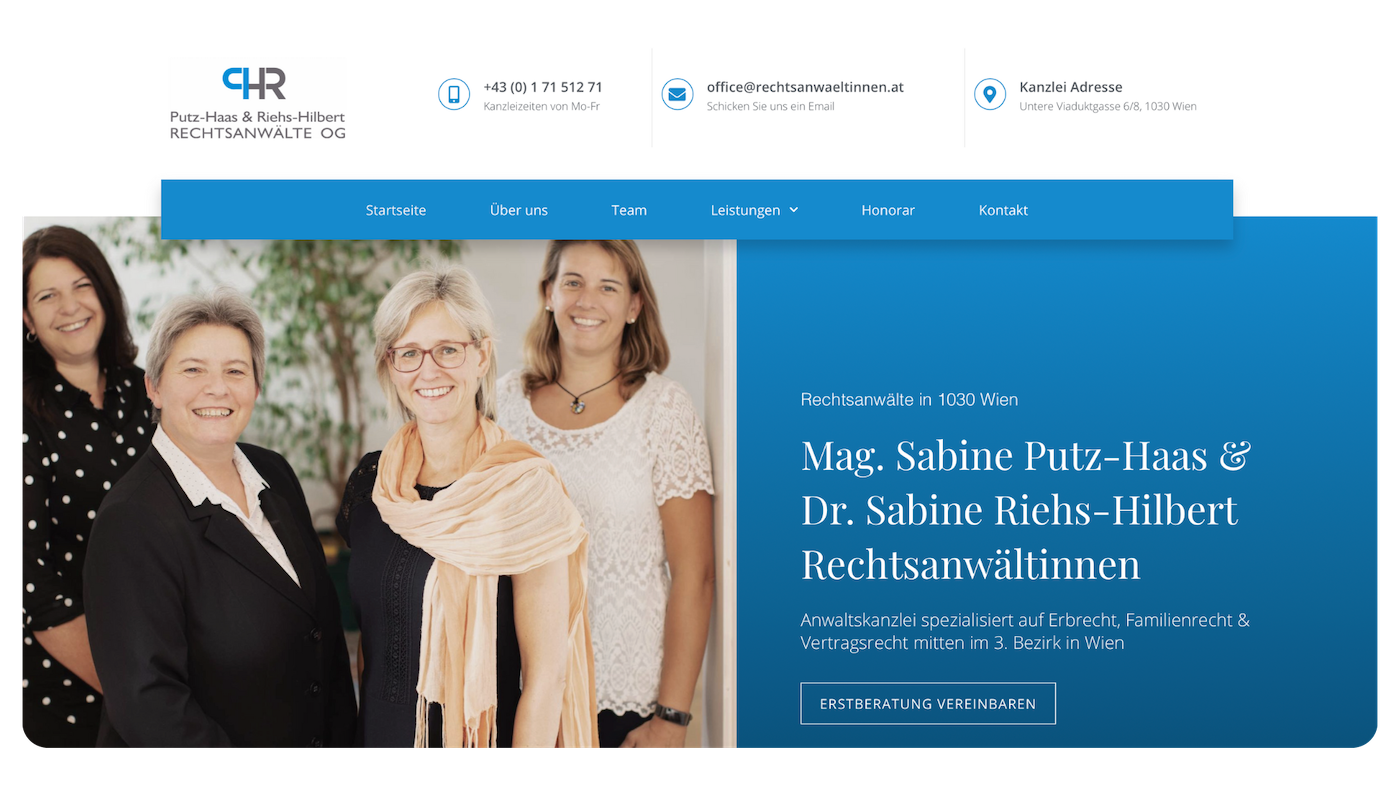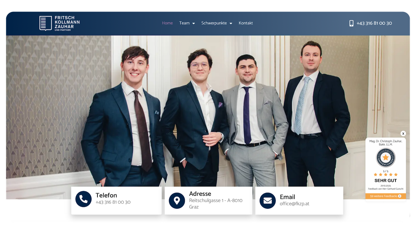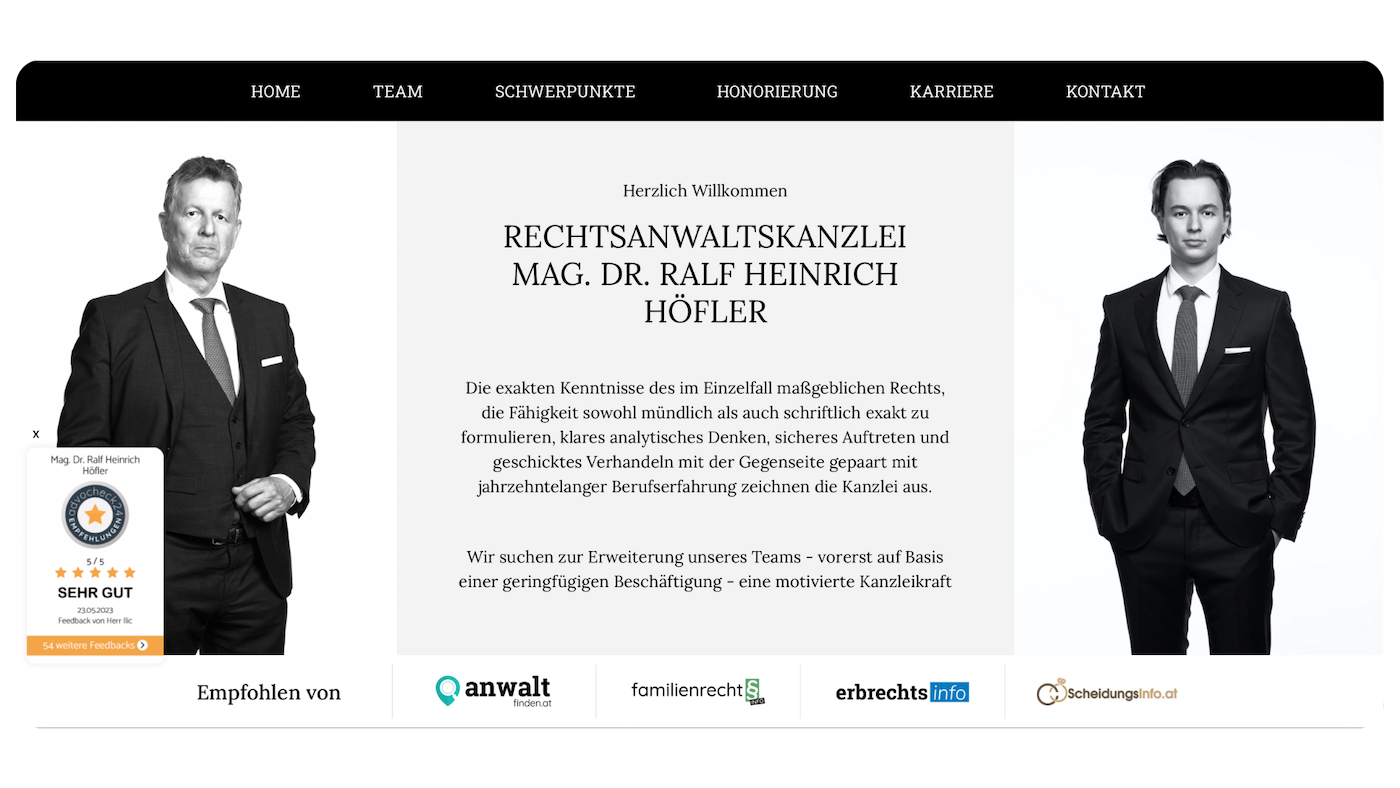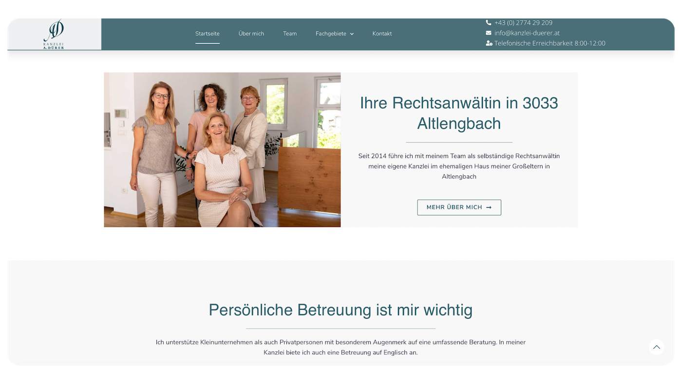 Ein professioneller, klar strukturierter Auftritt, der Kompetenz ausstrahlt und Mandanten sofort Vertrauen gibt.