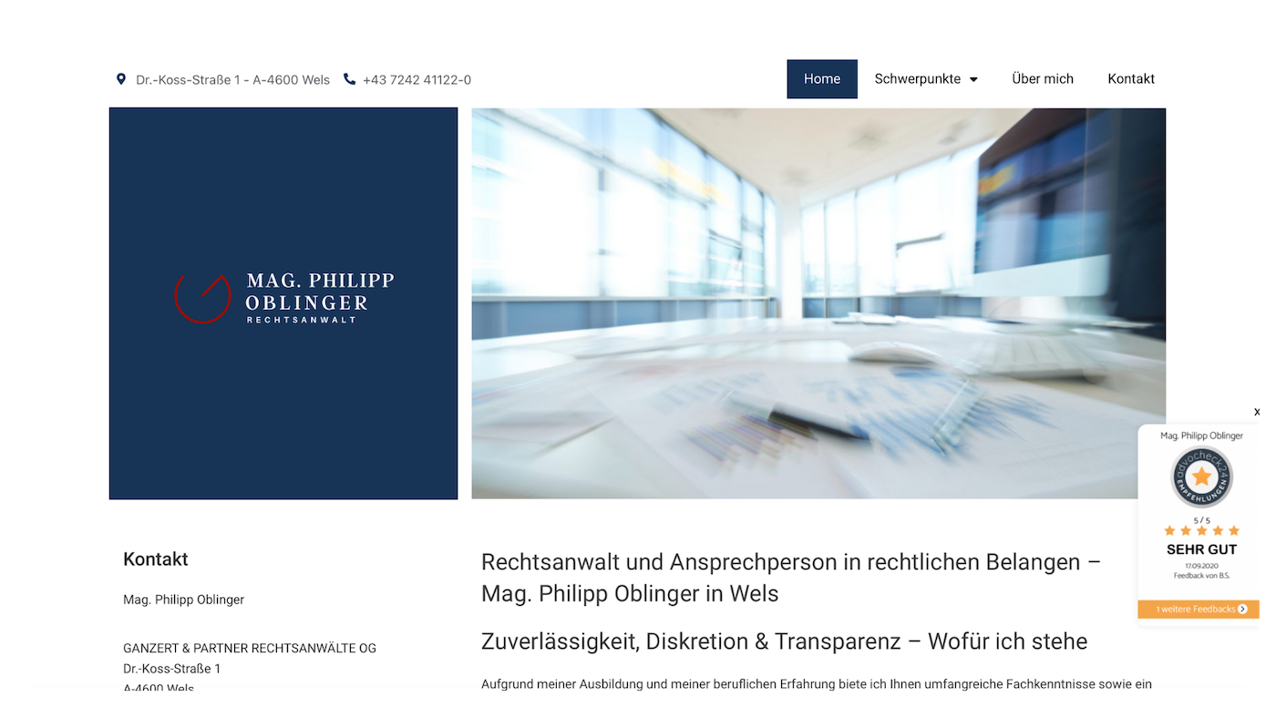 Die Website verknüpft Ihre Kanzleidaten, Rechtsportale, Bewertungen und Rechtstipps – ein wichtiger Faktor für Relevanz und korrekte Einordnung.